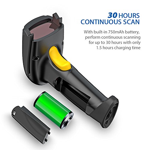 BATTERY 750mAh per 30h CONTINUOUS SCAN: Press up to 30 hours continuous scan for your inventories. Recharge easily in 1.5 hours via the included USB charging cable. Continuous scanning and automatic inventory mode make batch code decoding more efficient